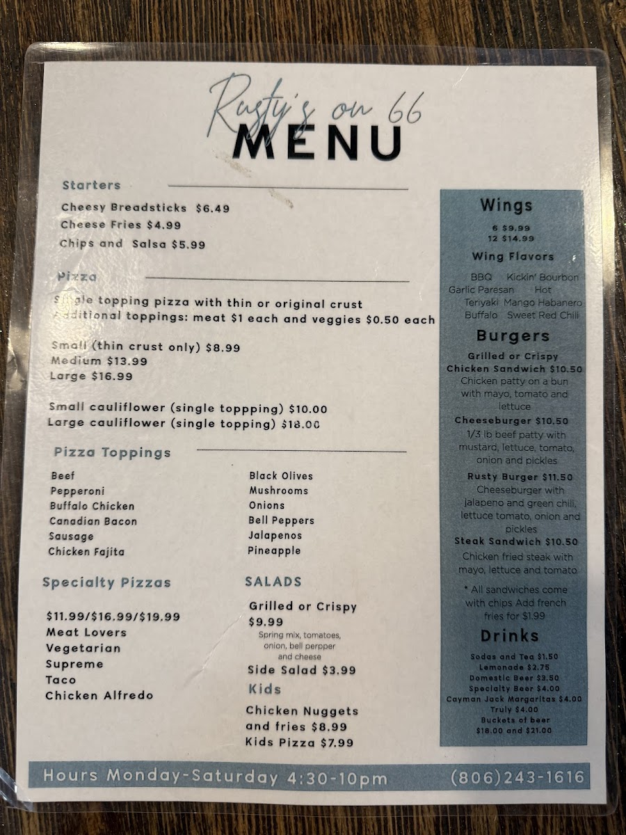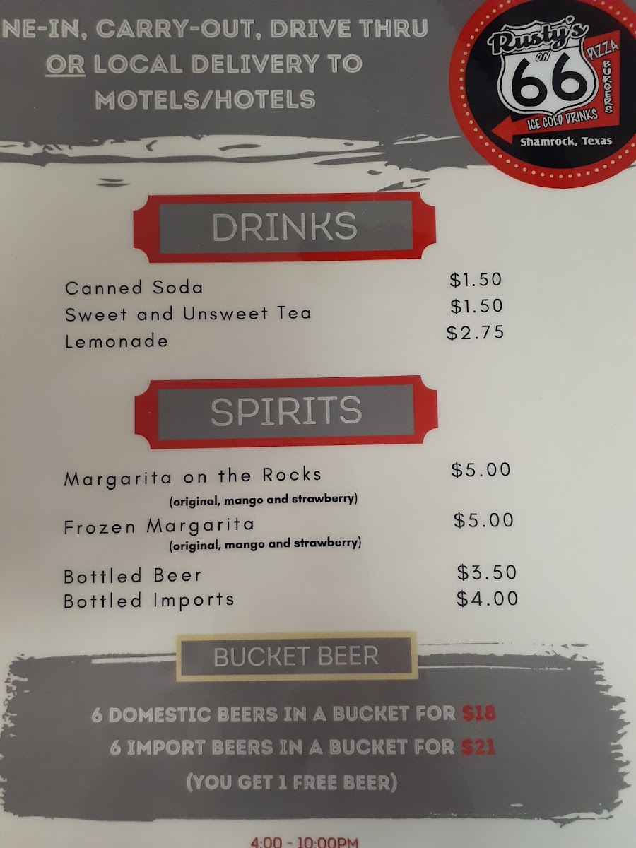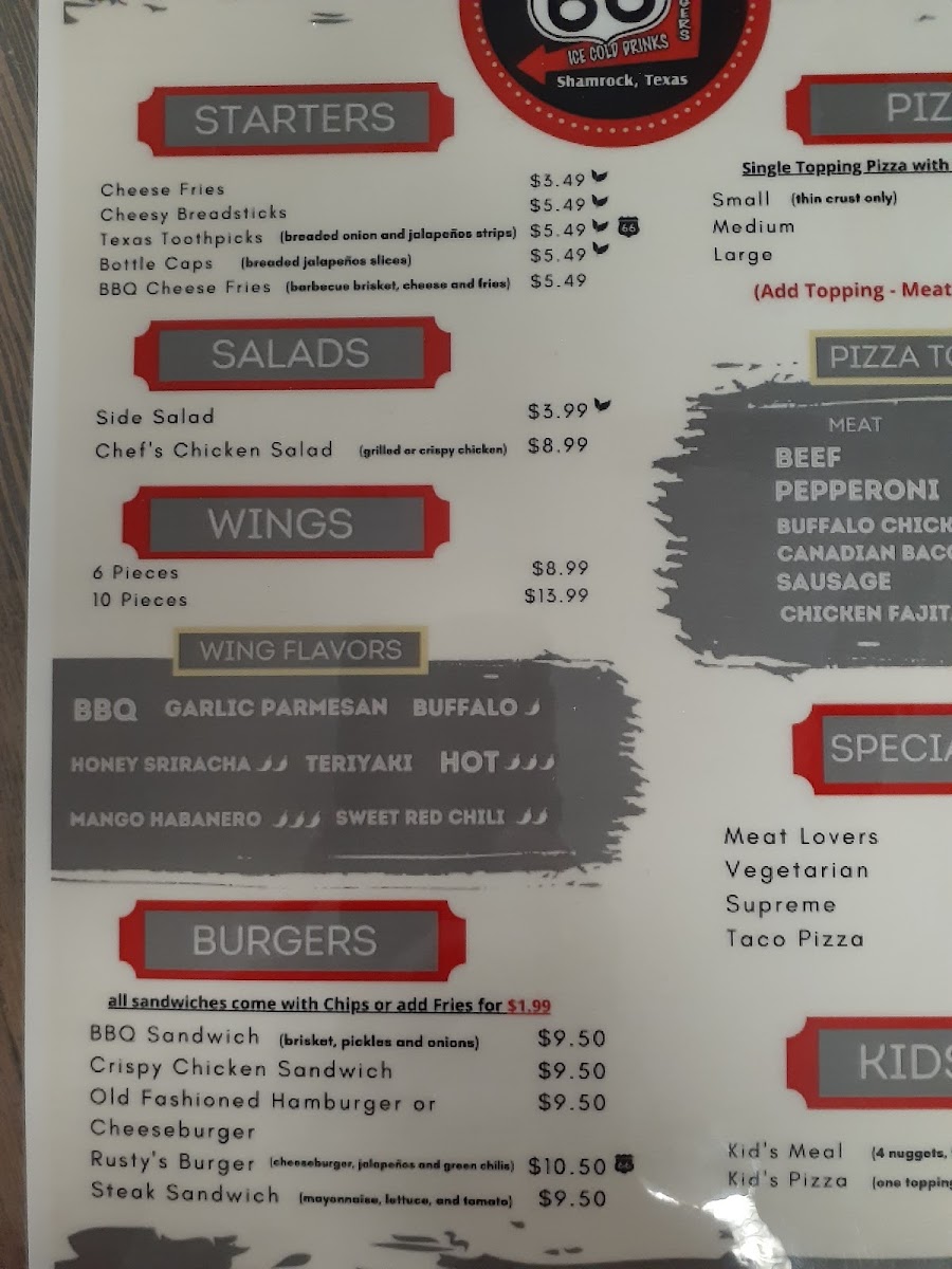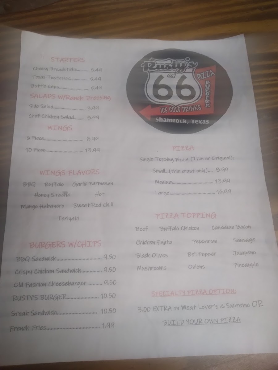 Nestled at 207 State Spur 556 in Shamrock, TX, Rusty's Shamrock stands out as a beloved local haunt. This charming establishment combines the warmth of small-town hospitality with a diverse menu that caters to every craving. Diners rave about the tantalizing selection, with standout items including the signature Rusty burger, delicious wings, and mouthwatering pizza, particularly the cauliflower crust option. The inviting atmosphere is filled with friendly locals, making it an ideal stop for travelers on Route 66.